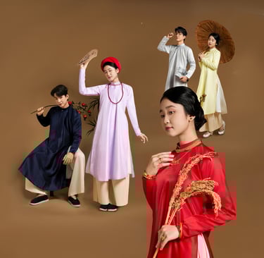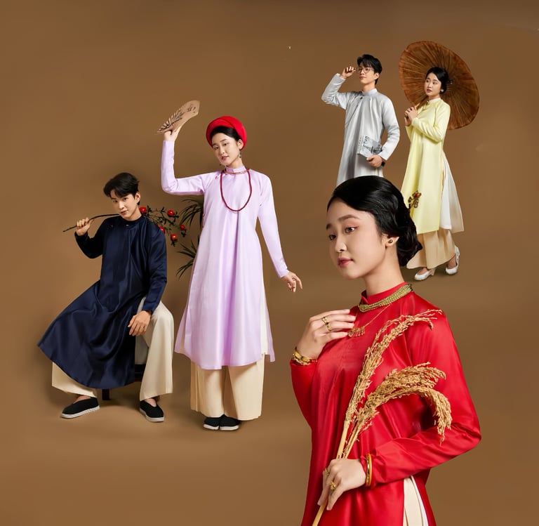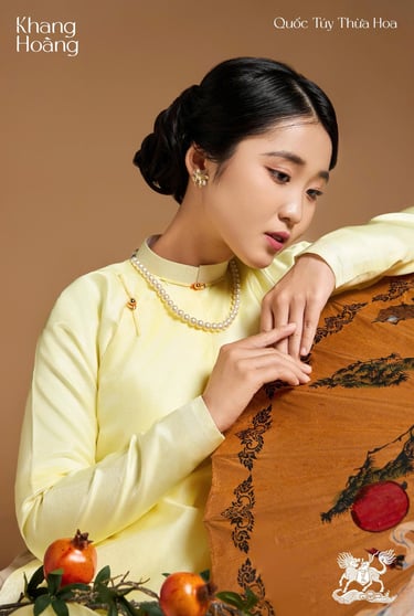 Một bộ ngũ thân lai cách tân, màu pastel, form dài chấm đất, gài nút từ nam sang nữ, tôn dáng. Dành cho ứng dụng vào đời sống – đặc biệt phù hợp sự kiện cưới hỏi.